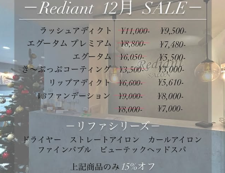 今年もRediant 12月SALEが始まります*° 2025年12月7日 物販も大人気のリファシリーズもお得に買えるのでぜひこの機会にお買い求めください·͜· ❤︎ ※11月から取置きご予約受付中です!お渡しは12月になりますのでご了承ください。 ← 前の記事 すべてのお知らせを見る 次の記事 →